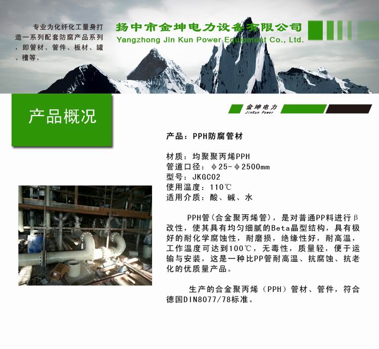 PPH管(均聚聚丙烯管),是对普通PP料进行改性,使其具有均匀细腻的Beta晶型结构,具有极高的耐化学腐蚀性,耐磨损,绝缘性能好,耐高温,工作温度可达100℃,同时还具有较高的稳定性,其抗老化,抗腐蚀,耐高温的性能均高于PP管。广泛应用于钢厂(酸洗、酸再生、酸雾)、烟气脱硫、工艺冷却水和化工行业的腐蚀性介质的输送。